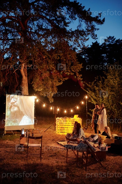 Молодые друзья отдыхают и смотрят фильмы вечером в естественной среде