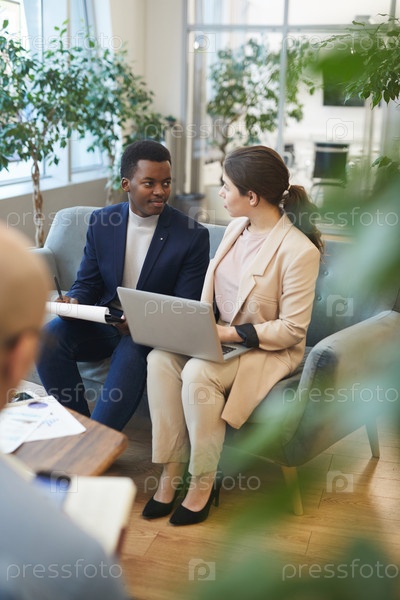 Афроамериканский бизнесмен разговаривает с коллегой в вестибюле
