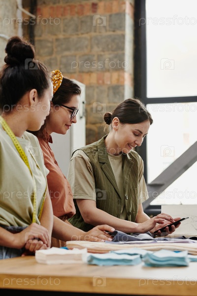 Счастливый креативный дизайнер со смартфоном показывает своим коллегам некоторые новые предметы