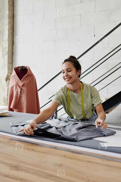 Улыбающаяся портная работает над новым заказом клиента или ее собственной модной коллекцией
