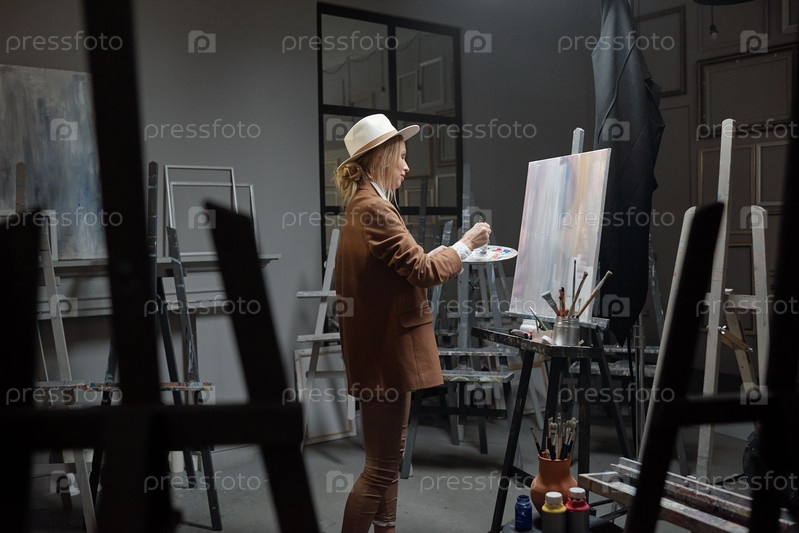 Красивая блондинка с цветовой палитрой стоит перед эстафетой с бумагой