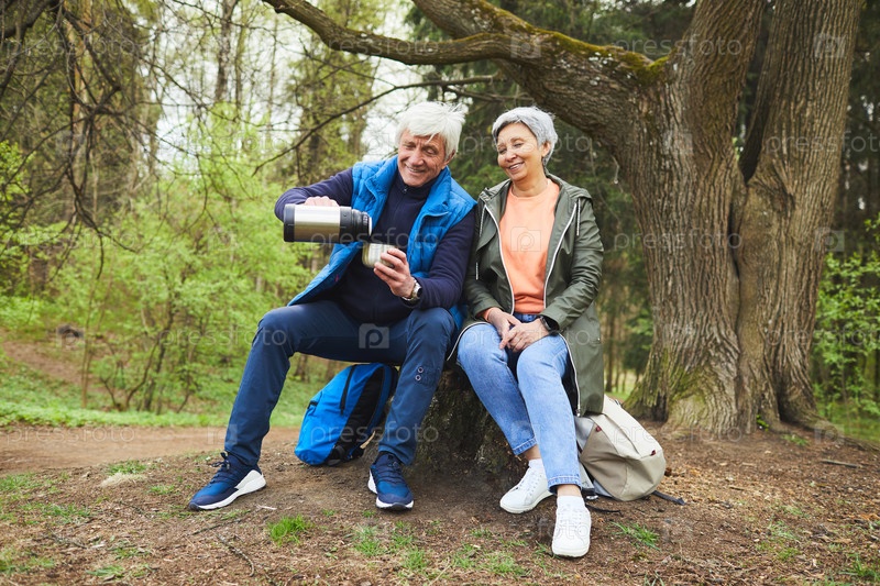 Активная старшая пара наслаждается горячими напитками во время похода в лес