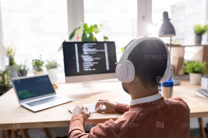 Задний вид молодого IT-менеджера в наушниках, нажимающего клавиши компьютерной клавиатуры