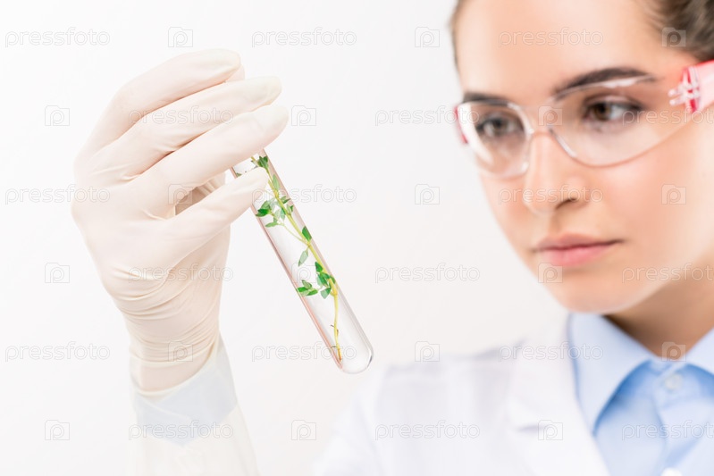 Молодая женщина-биолог в перчатках и очках смотрит на флакон с растениями