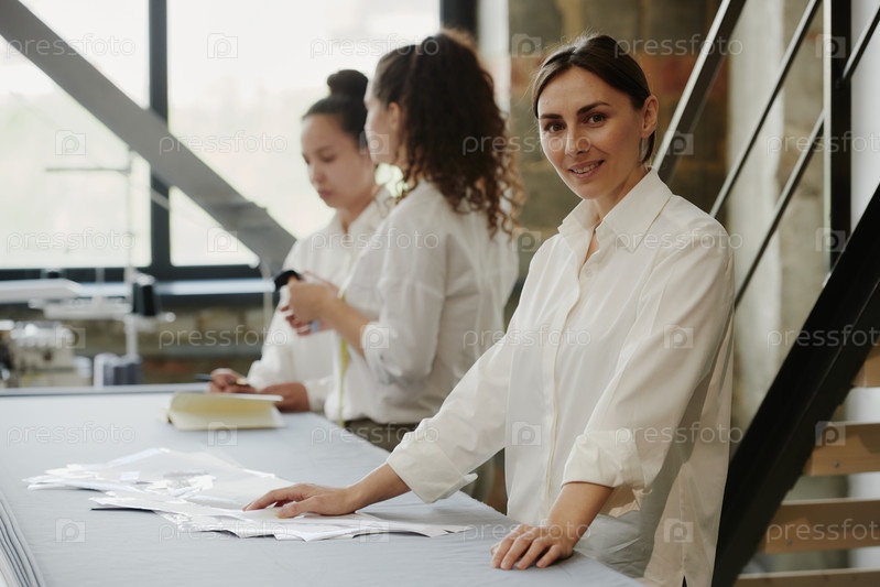 Молодая креативная дизайнерка одежды смотрит на вас, стоя у стола