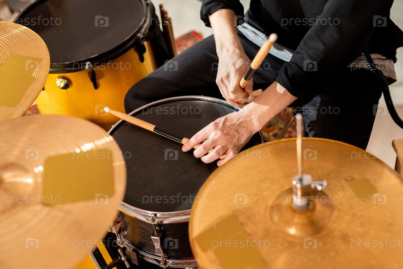 Руки молодого обычного барабанщика, берущего палочки сверху черного барабана