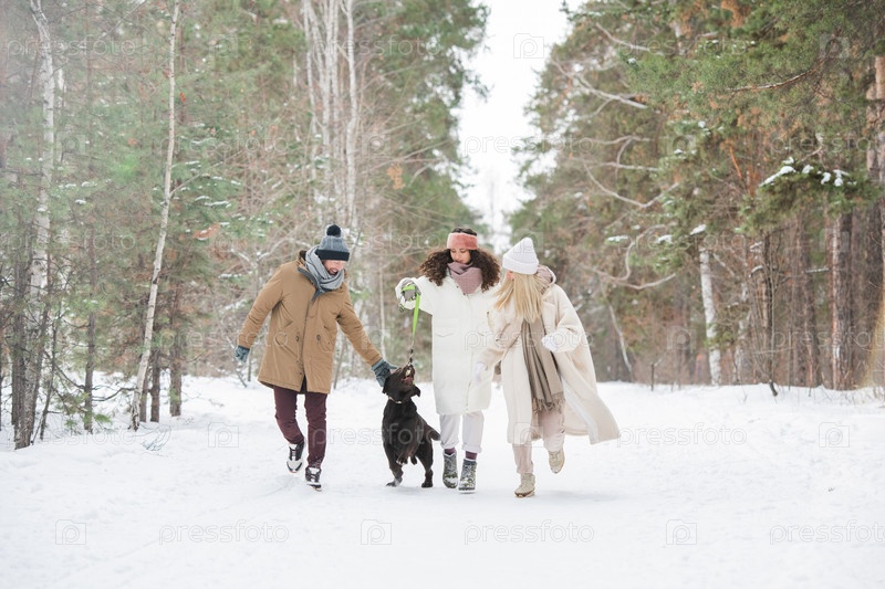 Черный ретривер играет с группой счастливых молодых друзей, бегущих по дороге