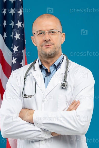Зрелый лысый врач в белом халате, скрестивший руки на груди и смотрящий на тебя