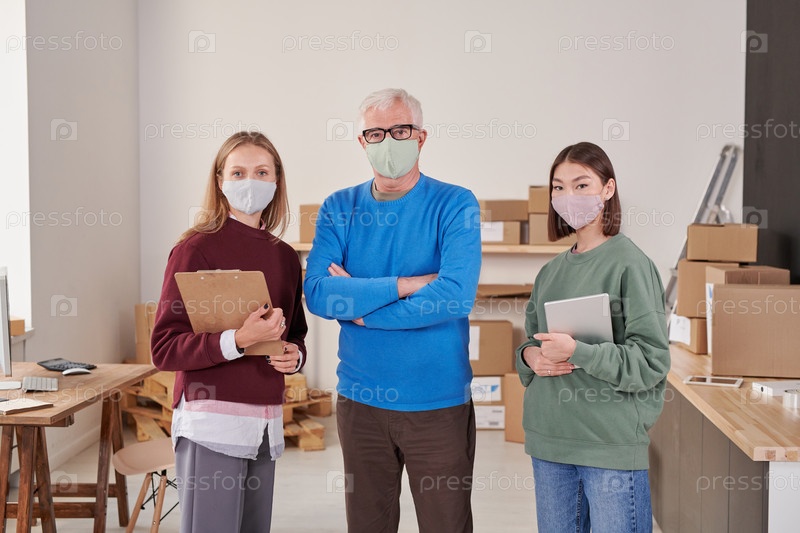 Портрет членов команды склада разного возраста, одетых в маски для лица и стоящих вместе на столбах ящиков и офисной мебели