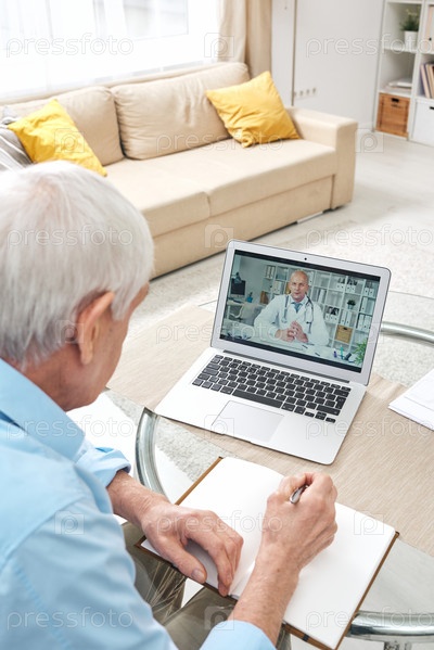 Пожилой человек с ручкой смотрит онлайн медицинскую консультацию и делает заметки
