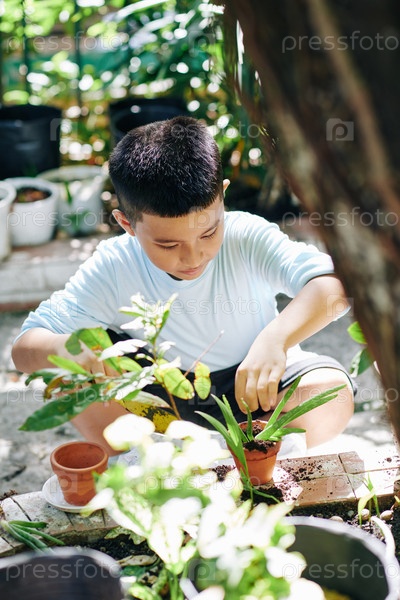 Мальчик пересаживает растения