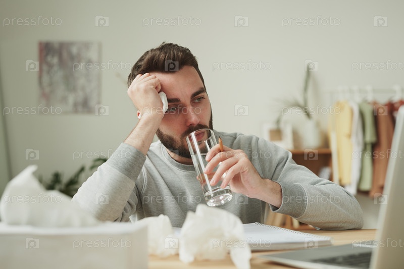 Загруженный молодой человек с платками, выпивая стакан воды перед ноутбуком