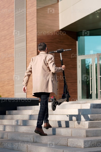 Обратный взгляд на молодого элегантного бизнесмена в умной повседневной одежде, несущего скутер