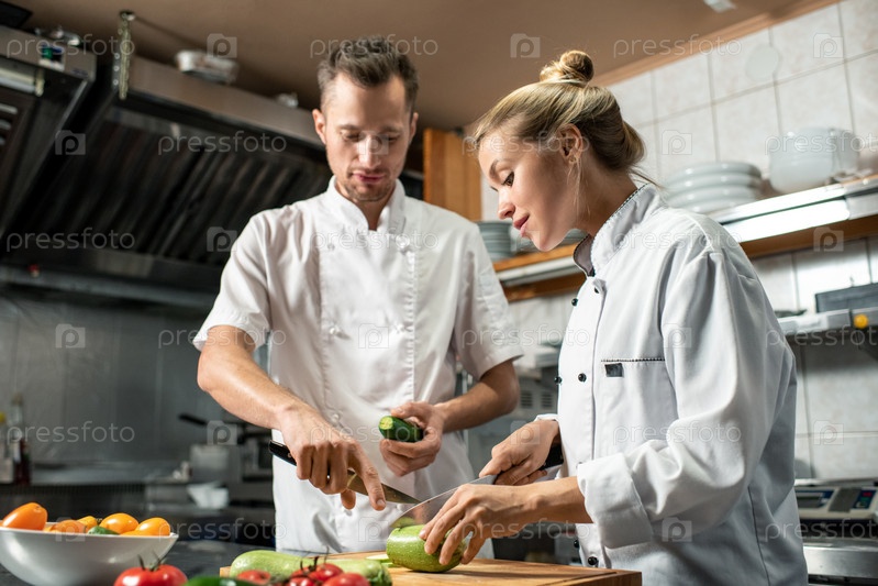 Молодой уверенный в себе профессиональный шеф-повар с ножом и огурцом консультирует своего стажера