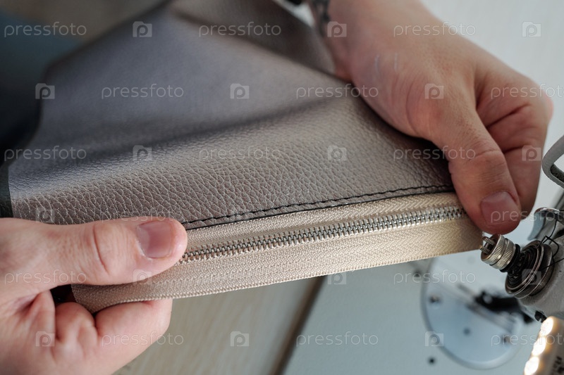 Руки мужского кожевенника, держащего кусок кожи с молниеносной резинкой на машине