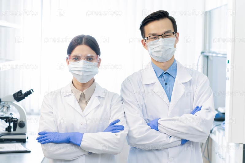 Два молодых маскированных межкультурных ученых в белых халатах и перчатках