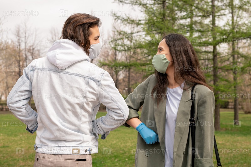 Дружелюбный мужчина и женщина в защитных перчатках и масках делают локтевой удар