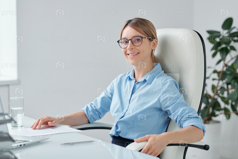Молодая веселая блондинка-бизнесвумен в формальной одежде и очках, работающая за столом