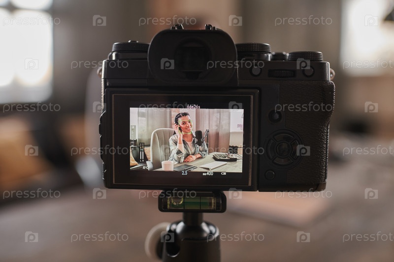 Горизонтальный крупный снимок камеры записывает видео стильной женщины с наушниками, сидящей за столом в комнате на чердаке и создающей контент для своего блога