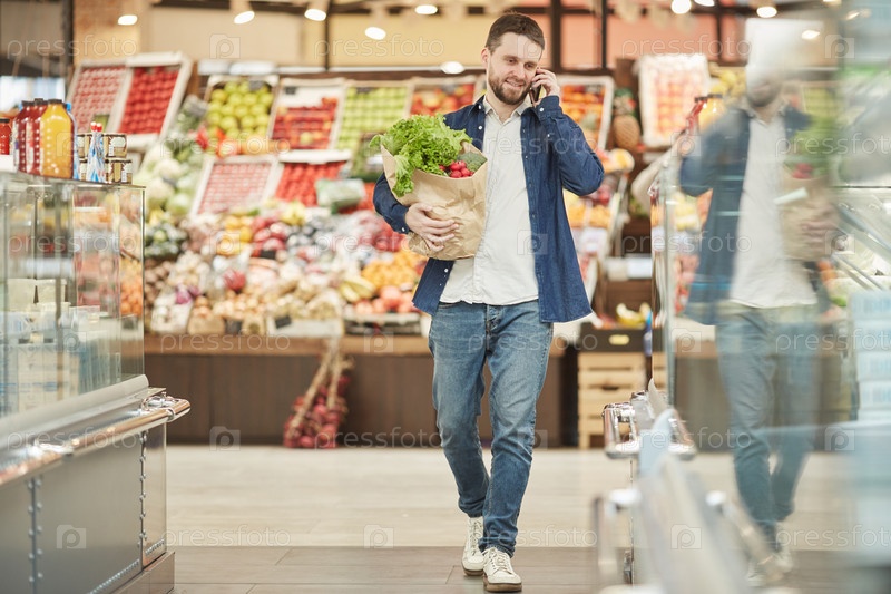 Взрослый мужчина звонит со смартфона в супермаркете