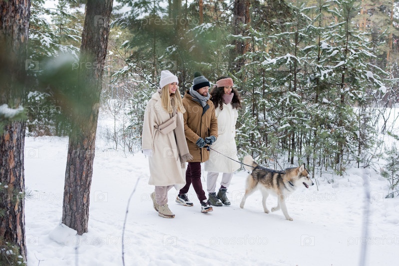 Три друга, ходящие с собакой Лайки