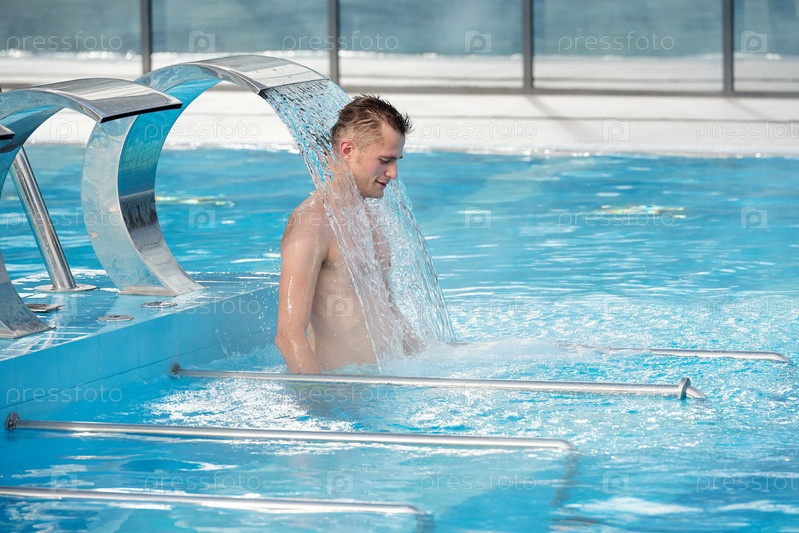 Молодой красавчик стоит в расслабляющем курортном водопаде в голубой прозрачной воде