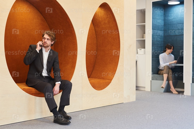 Молодой бизнесмен в графическом офисном интерьере