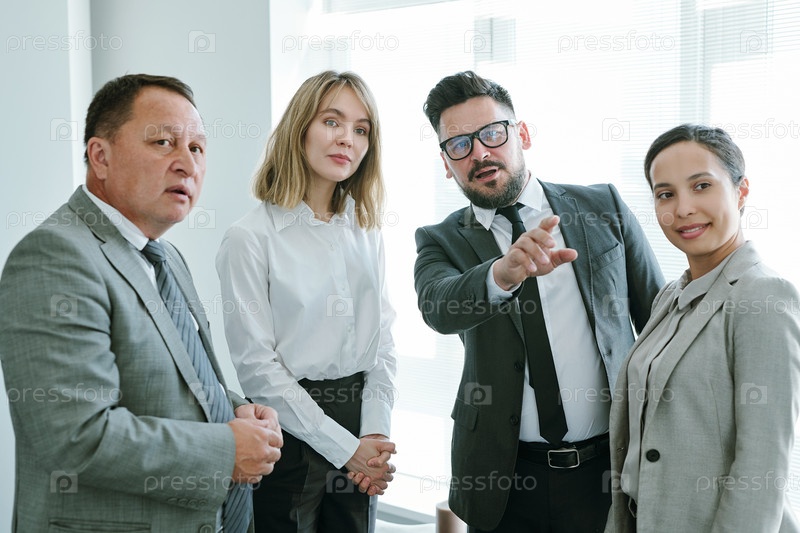 Уверенный зрелый бизнесмен, указывающий вперед, стоя среди коллег