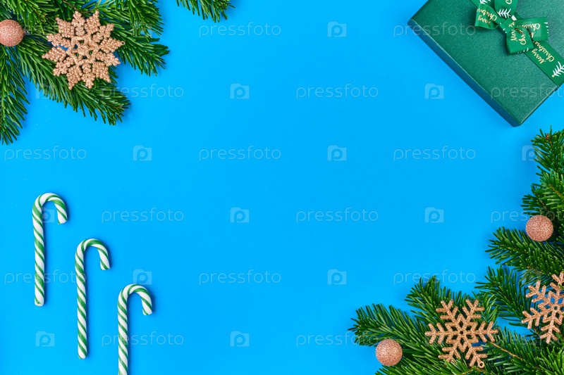Снежинки и шары на вечнозеленых хвойных ветвях, сахарные трости и подарочный ящик