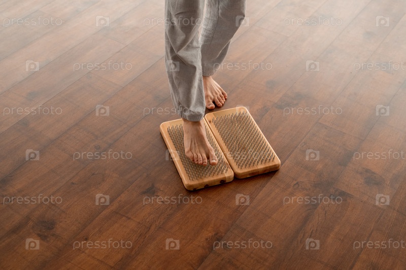 Ноги молодого активного босика в серых спортивных брюках, стоящего на подушках для йоги