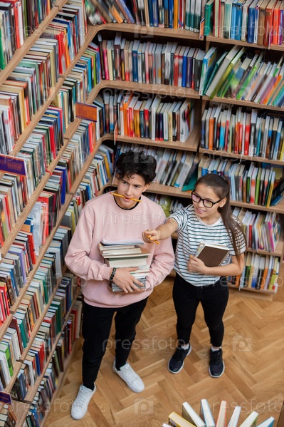 Красивая девочка-подросток в повседневной одежде, указывающая на одну из книг на книжной полке