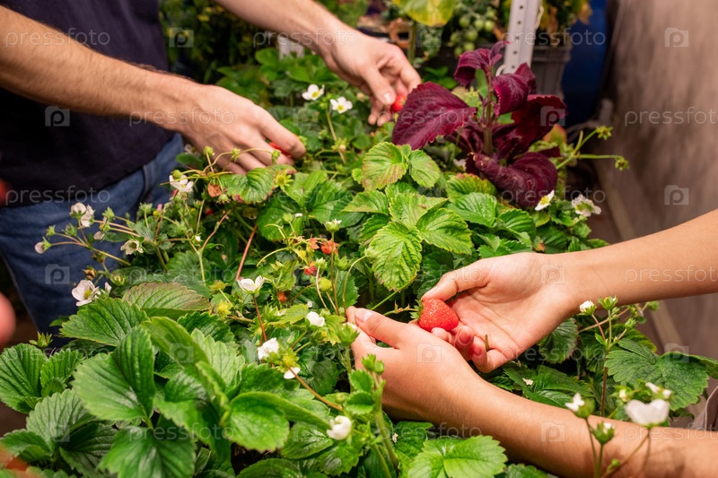 Руки двух современных фермеров, собирающих спелые клубники в теплице