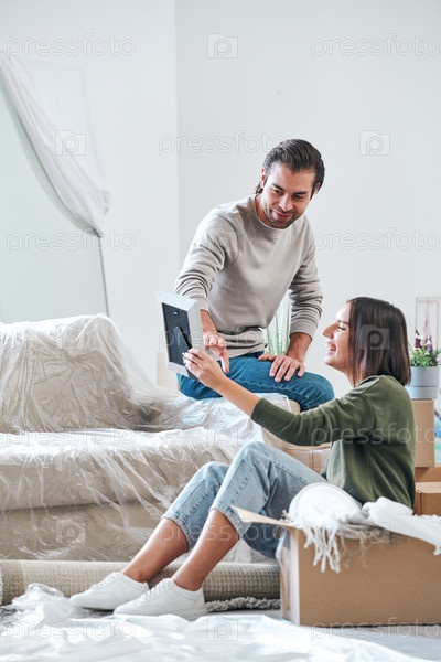 Счастливая молодая жена показывает мужу фото в раме во время обсуждения