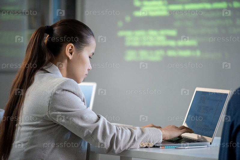 Студентка технического университета, сидящая перед ноутбуком и экраном
