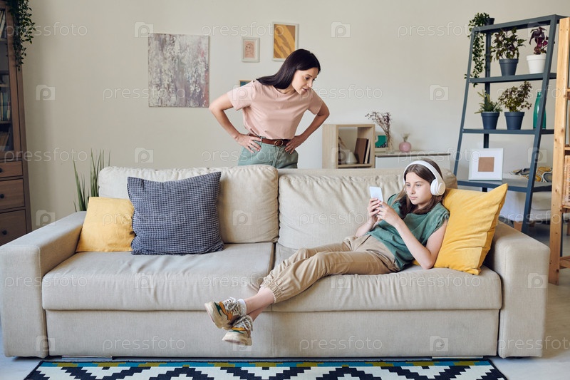 Строгая мать держит руки на талии, стоя рядом с дочерью на диване