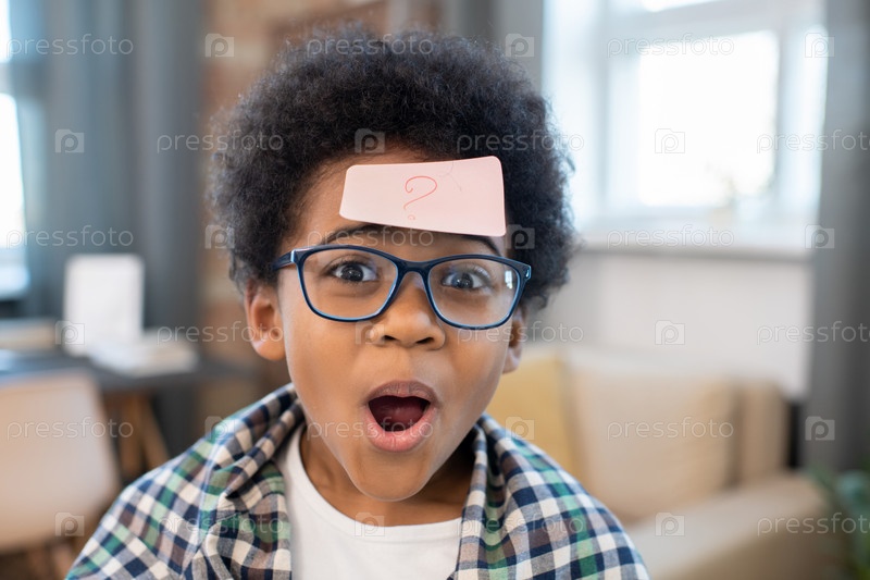 Милый мальчик смешанной расы с тетрадью со знаком вопроса на лбу