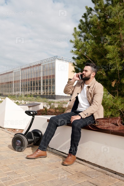 Молодой бородатый занятый мужчина в элегантной повседневной одежде разговаривает со своим смартфоном на улице