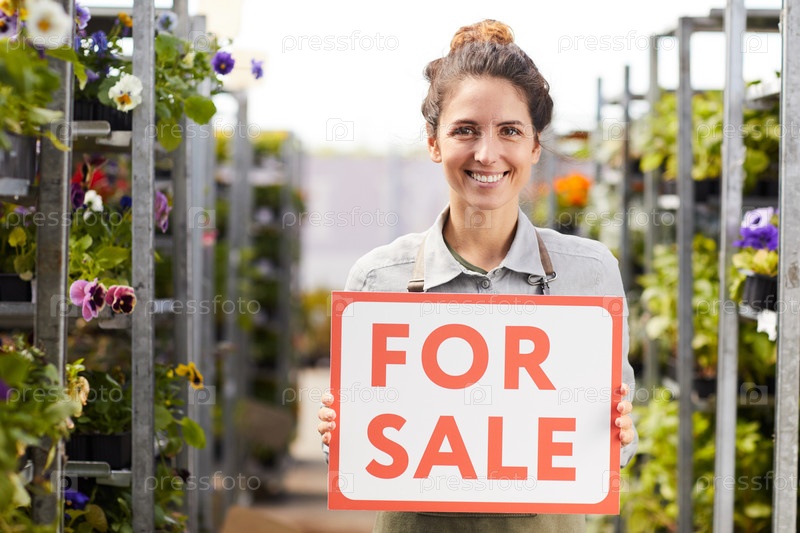 Улыбающаяся женщина держит для продажи знак на плантации