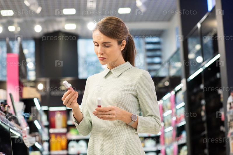 Красивая молодая женщина в элегантном платье выбирает блеск для губ из новой коллекции
