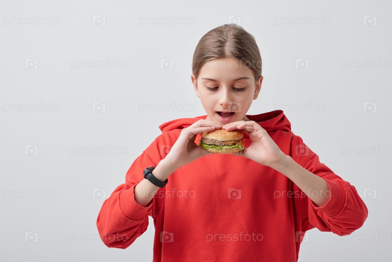 Молодая девушка в красной толстовке с капюшоном держит аппетитный гамбургер открытым ртом