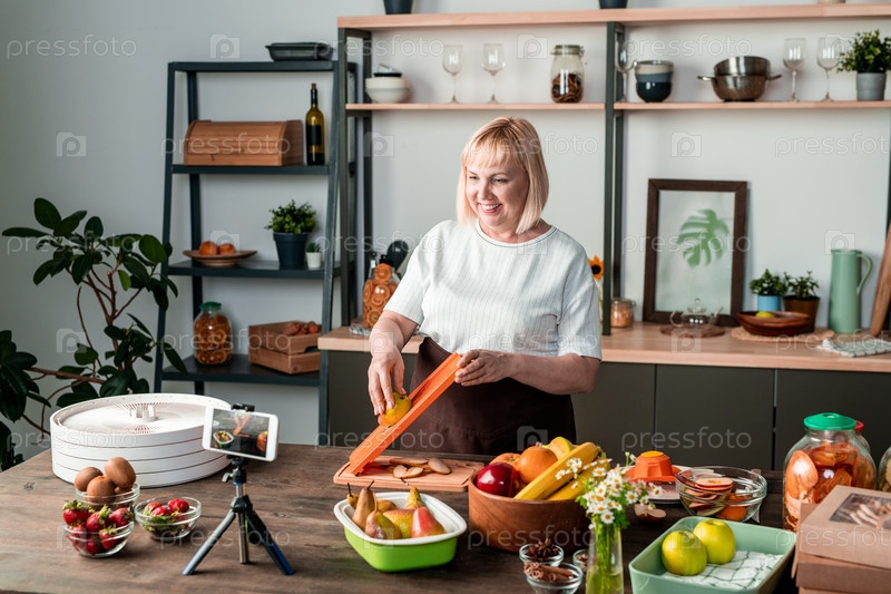 Счастливая блондинка средних лет смотрит в камеру смартфона во время приготовления пищи