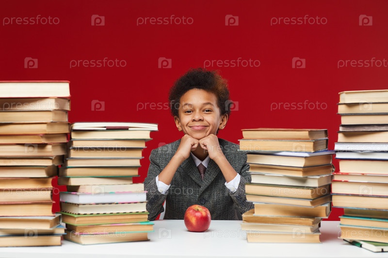 Милый школьник за столом с книгами