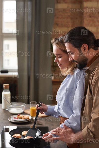 Вертикальный боковой вид портрет любящего мужчины и женщины, проводящих утро на кухне лофта, готовя завтрак и флиртуя