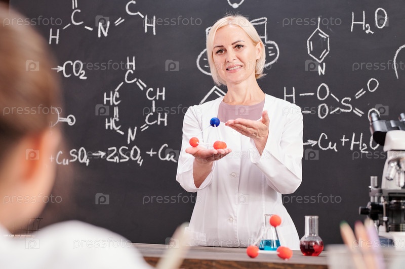 Улыбающийся учитель химии представляет модель молекулы химического соединения