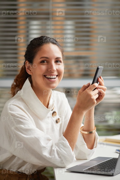 Улыбающаяся взрослая деловая женщина использует смартфон на рабочем месте