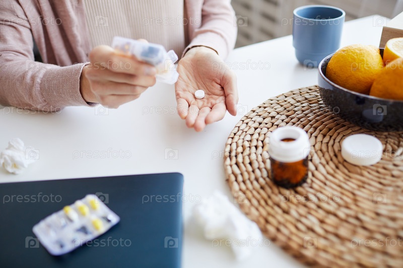 Женщина пьет таблетки от температуры