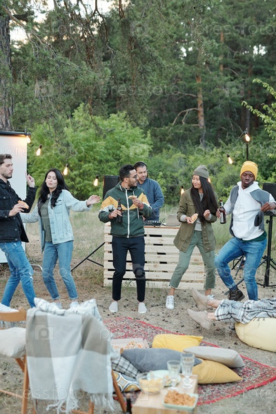 Молодые веселые друзья едят пиццу с пивом и танцуют в естественной среде