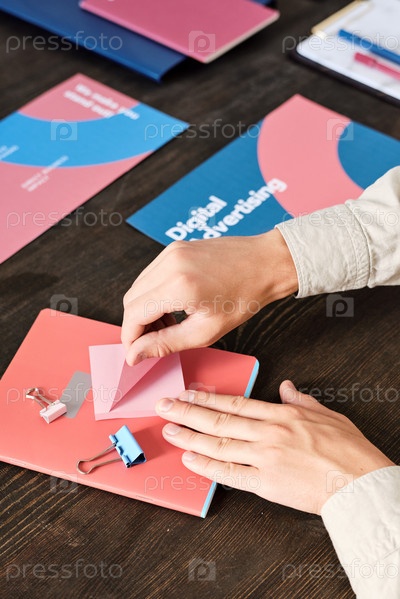 Руки офисного менеджера, сидящего за столом и снимающего записную бумагу для записи