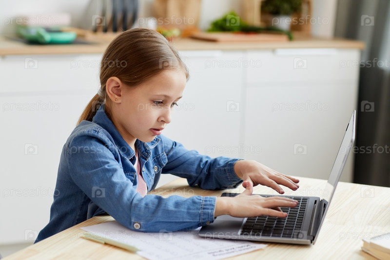 Побочный взгляд на девочку, использующую ноутбук для учебы дома