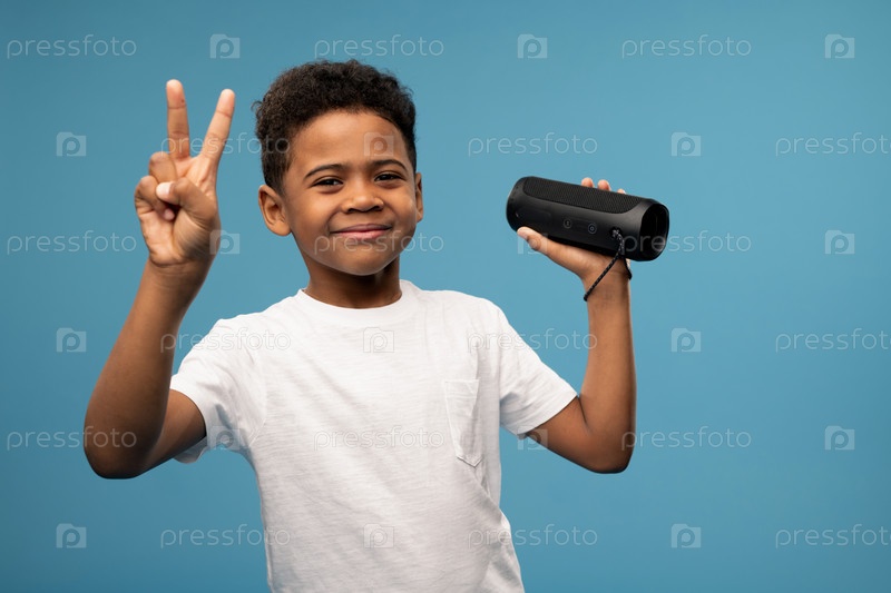 Веселый маленький мальчик африканской национальности показывает мирный жест, развлекаясь